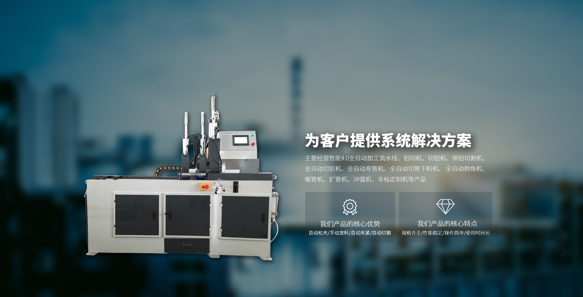 主要經營智能4.0全自動加工流水線、鋁切機、切鋁機、銅鋁切割機、全自動切鋁機、全自動彎管機、全自動切管下料機、 全自動倒角機、縮管機、擴管機、沖弧機、非標定制機等產品